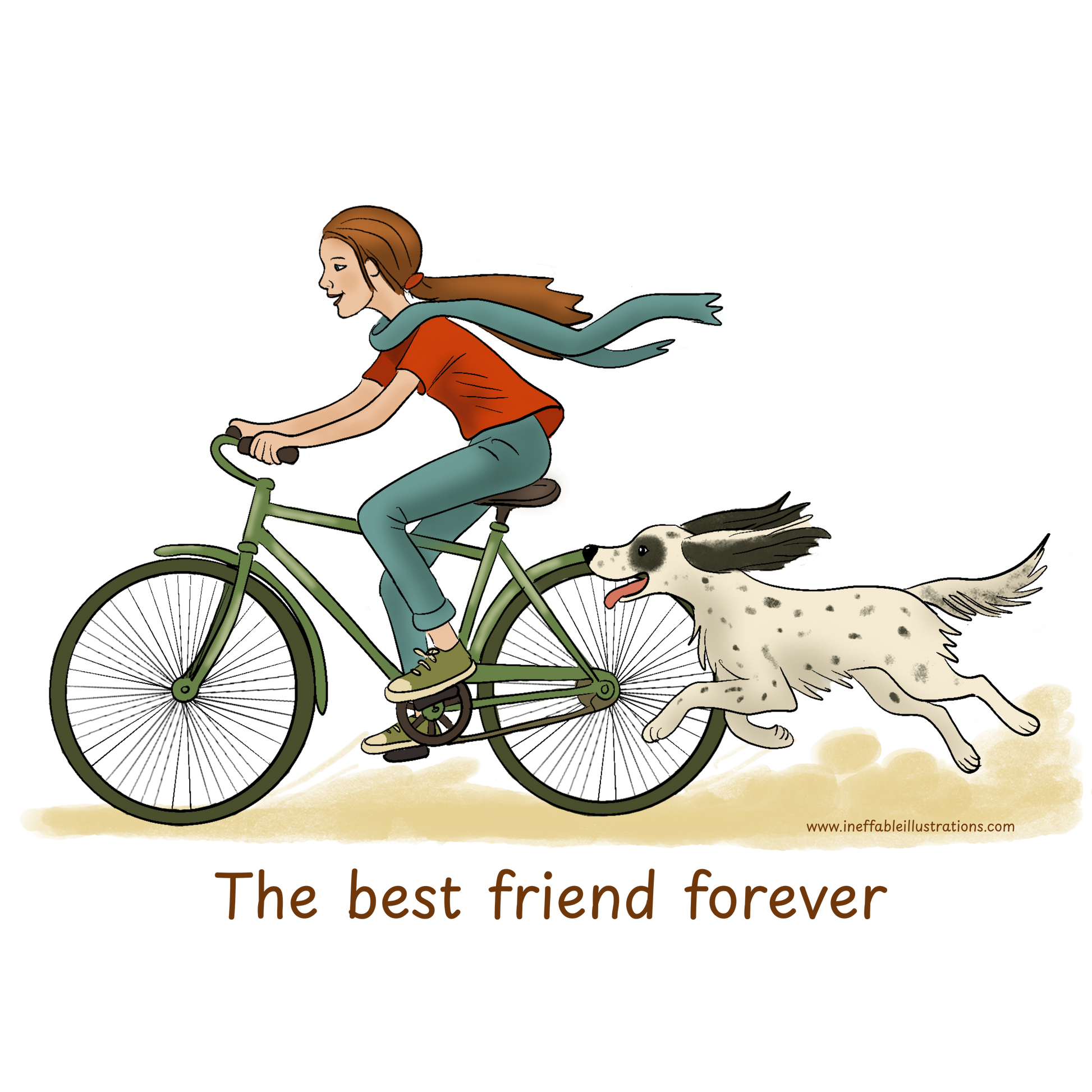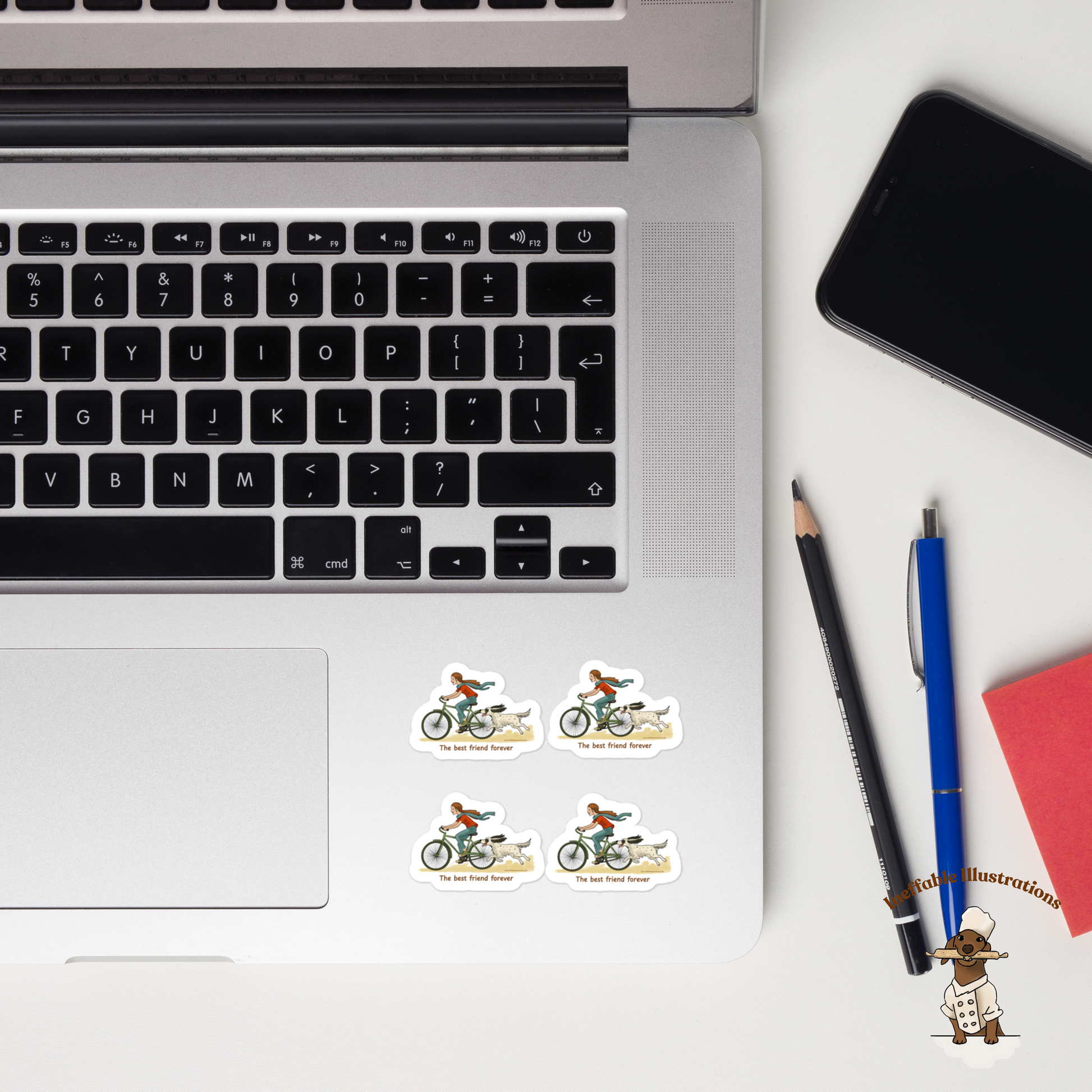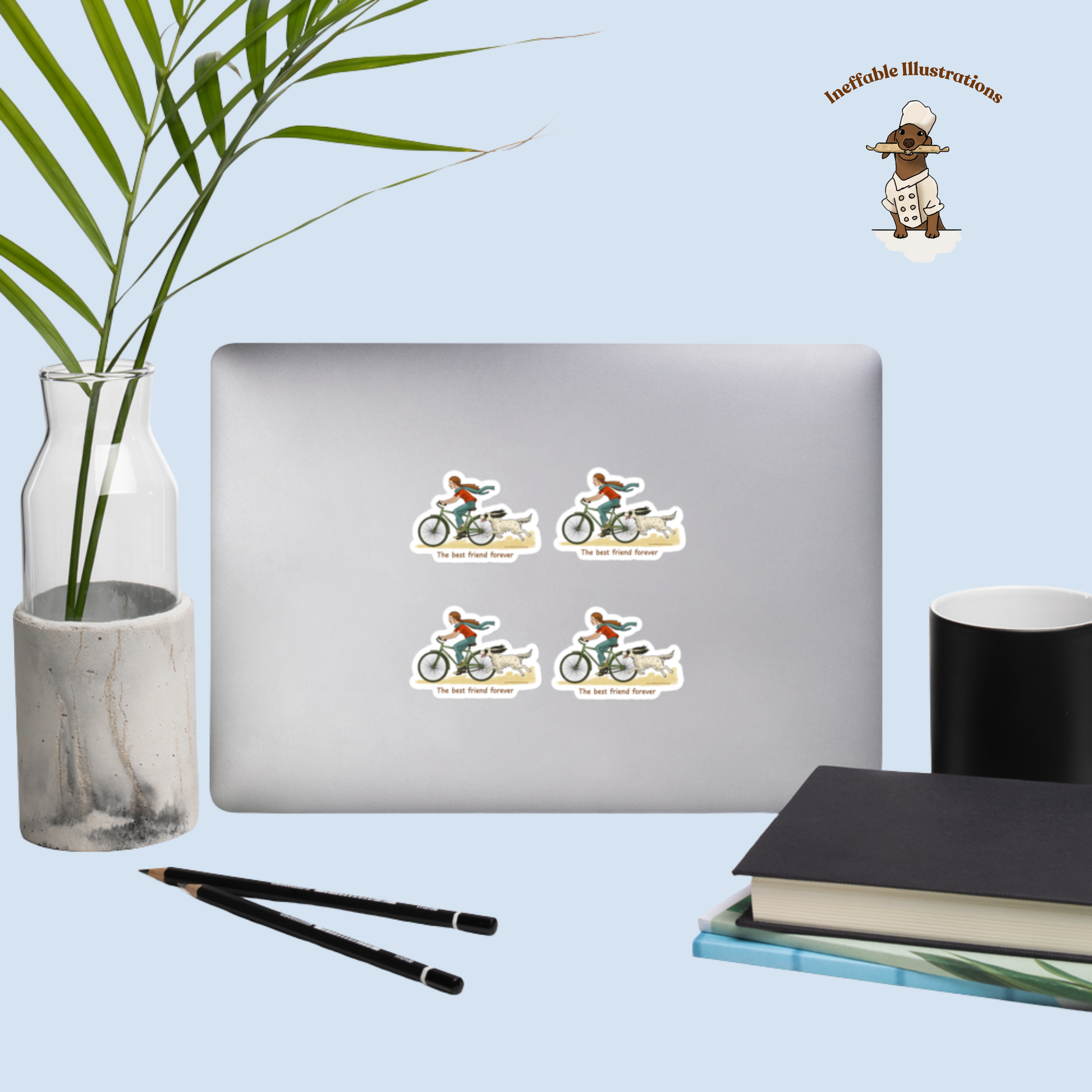 Celebrate the joy of friendship with this adorable 4-pack of Molly & Zagi bicycle adventure stickers! Each pack contains 4 identical vinyl stickers featuring our beloved Molly riding her bicycle with her loyal English Setter companion Zagi running alongside in beautiful hand-drawn illustration style.