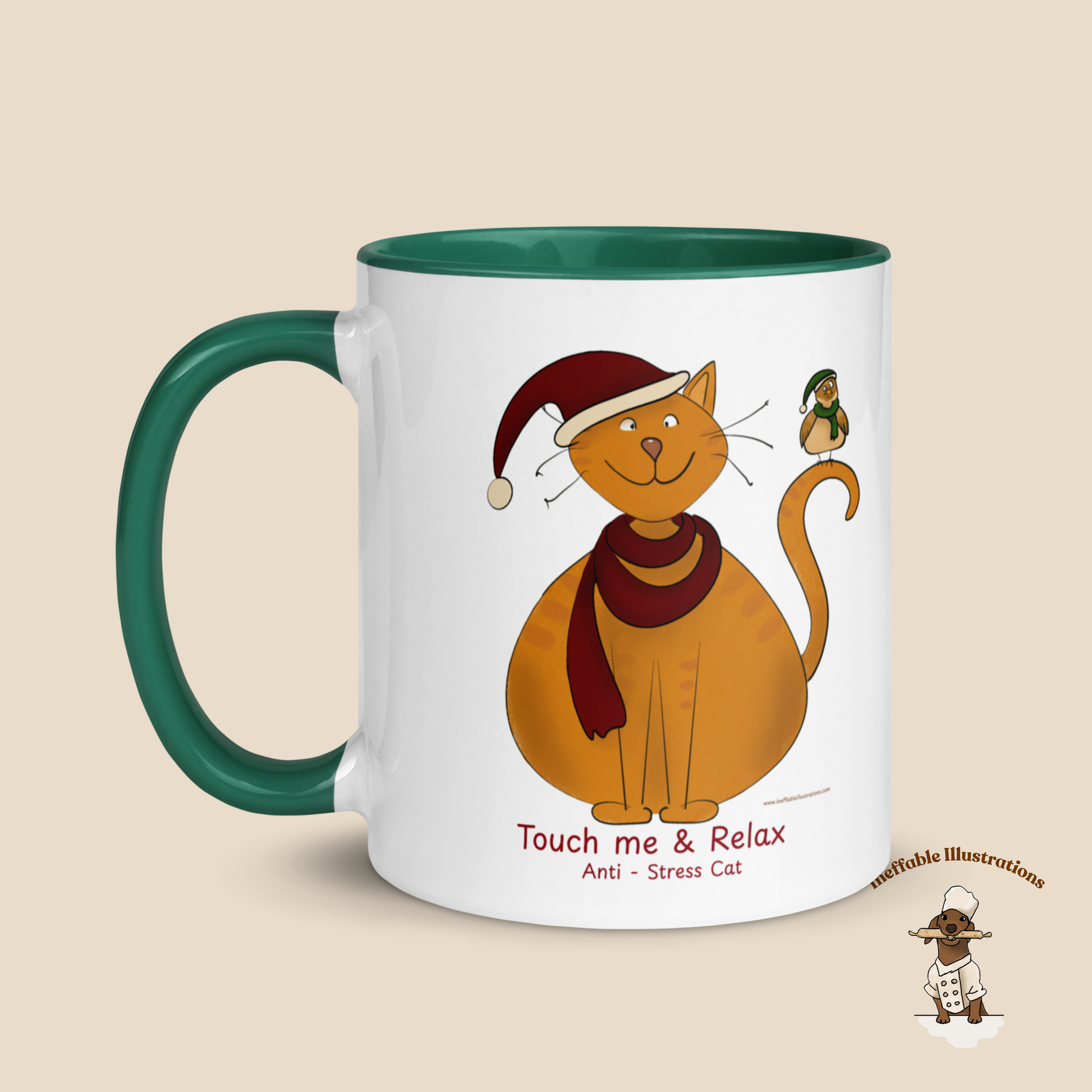This delightful ceramic Christmas mug features our beloved Anti - Stress cat wearing a festive Santa hat and cozy burgundy scarf, with a cheerful little bird friend perched on his tail. Anti - Stress cat's calm and relaxed demeanor makes this the perfect mug for peaceful Christmas moments and stress-free holiday mornings!