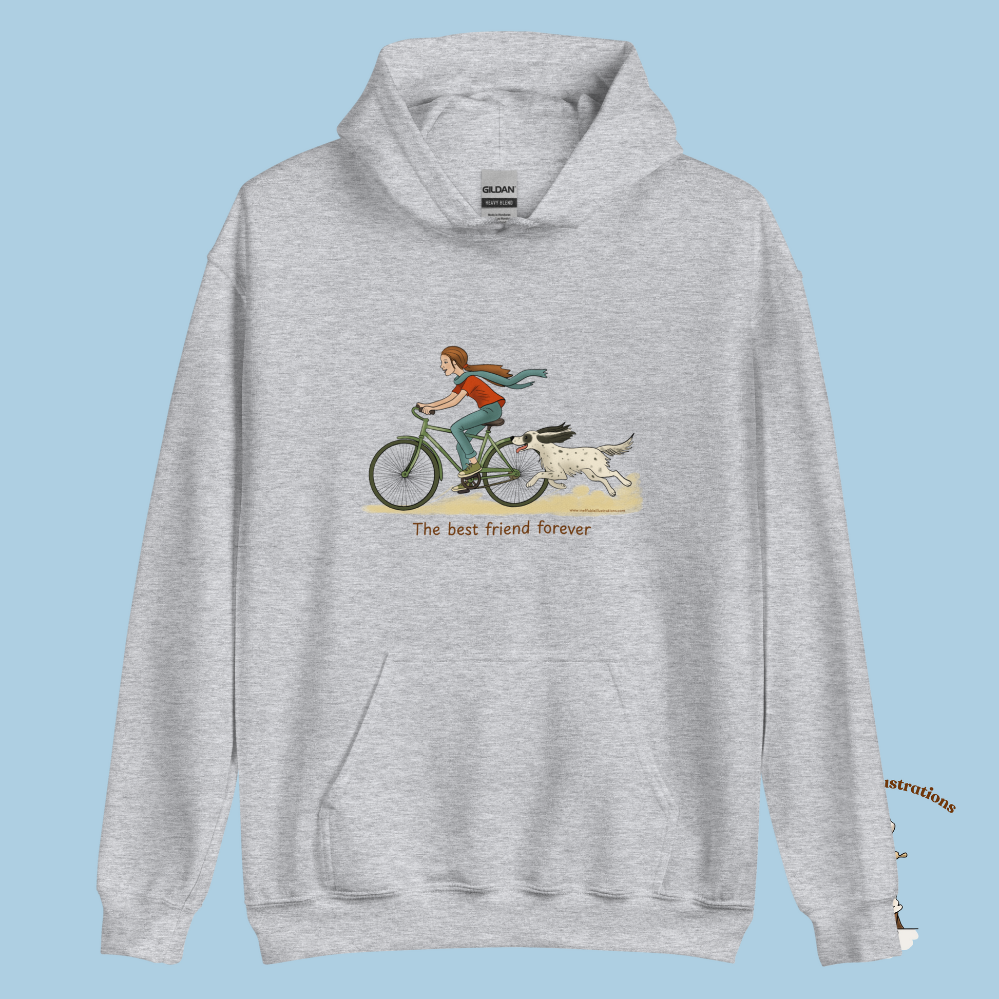 Stay cozy and celebrate your love for English Setters with this comfortable unisex hoodie! Features our beloved Molly riding her bicycle with her loyal English Setter companion Zagi in beautiful hand-drawn illustration style.